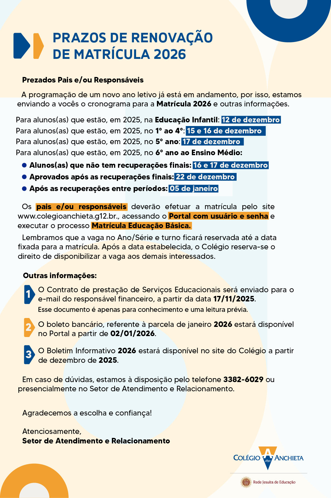 É com muita alegria que a Educação Infantil do Colégio Anchieta convida as famílias para prestigiarem as apresentações e [...]
