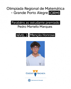 O Colégio Anchieta comemora a conquista do estudante Pedro Martello Marques, da turma 201, que recebeu Menção Honrosa na Olimpíada Regional de Matemática (ORM) Porto Alegre, participando pelo Nível 3, Ensino Médio.